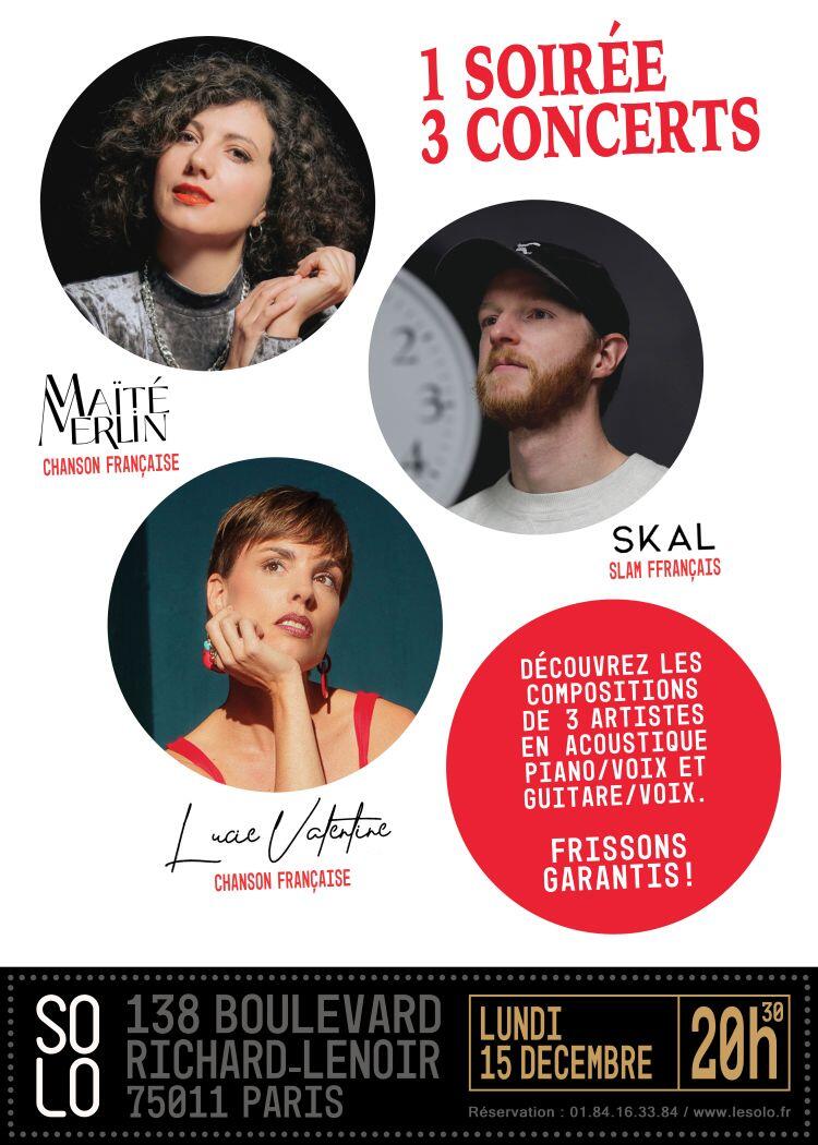 Entre puissance et fragilité, Maïté Merlin fait vibrer des hymnes à la liberté et à l’amour. Poétesse au verbe affûté, elle transforme ses émotions en uppercuts poétiques. Sur scène, sa voix puissante et habitée impose le silence, bouleverse et captive. Inspirée par le rock et la chanson française, elle fait résonner sa vérité avec ses nouveaux singles Murmure-moi, Pas le temps et Le virtuel, c’est mortel. Pour ce concert au Solo, elle s'accompagnera "solo" à la guitare et peut être même au piano...