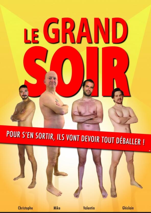 Pour s’en sortir, ils vont devoir tout déballer ! Quatre amis au chômage décident de monter un spectacle de strip-tease masculin. Mais comment passer du pôle emploi au pole dance quand on a des poils, du bide et qu’on n’est pas très futés ? Seule solution, il faudra tout déballer. Venez découvrir « Le grand soir », une comédie sexy et déjantée.