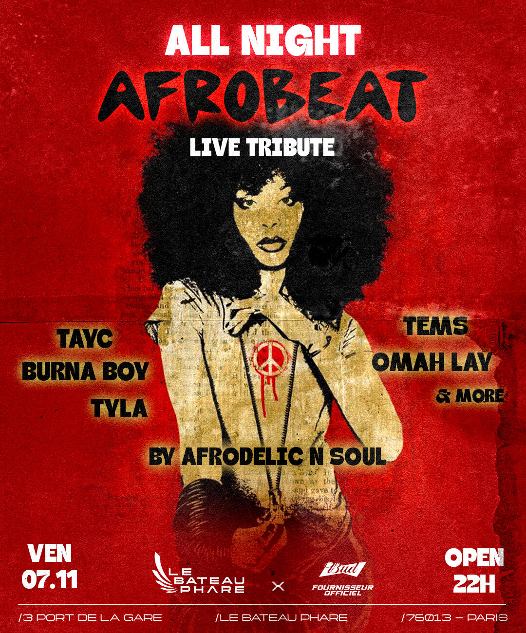 Le Vendredi 07 Novembre, de 22h à 4h, viens vibrer au rythme de l’Afrobeat au Bateau Phare !