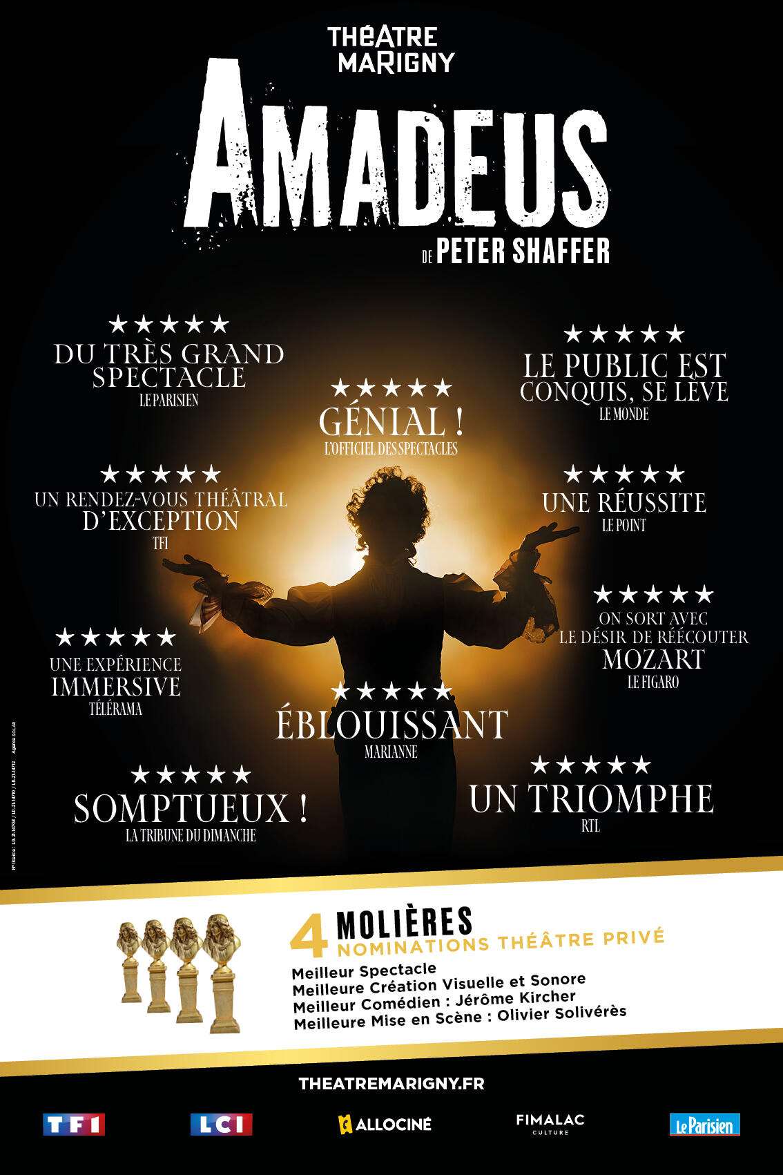 AMADEUS, le chef d’œuvre de Peter Shaffer rendu célèbre au cinéma par Milos Forman (8 Oscars 1985), est LE spectacle événement du Théâtre Marigny, avec une mise en scène signée Olivier Solivérès.
