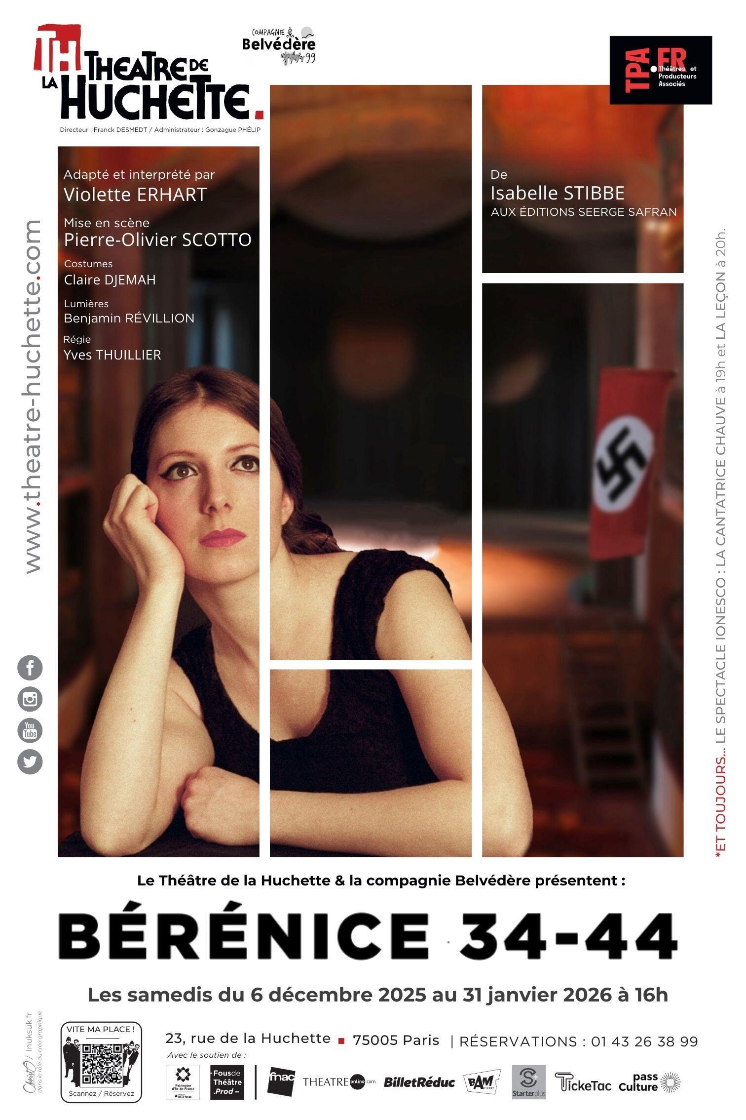 BÉRÉNICE 34-44 est un seul en scène adapté du roman de Isabelle Stibbe qui suit la vie d’une jeune comédienne juive durant les heures sombres de l’Occupation à la Comédie Française, quand la tragédie historique dépasse la tragédie théâtrale. Une pièce historique poignante et un immense cri d’amour au théâtre et à ses acteurs.