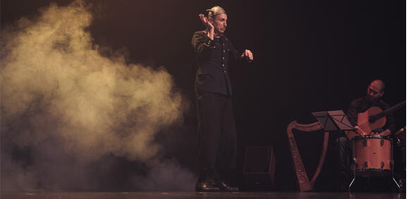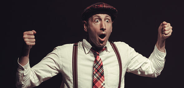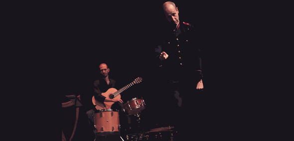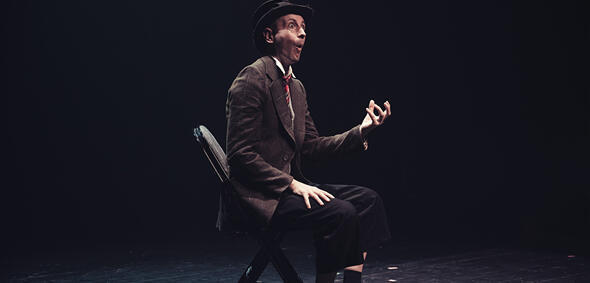 Un véritable tourbillon théâtral sans un mot (du moins, pas un seul compréhensible !) dans lequel le comédien nous embarque par le geste, les sons et une énergie débordante, accompagné en direct par un musicien.