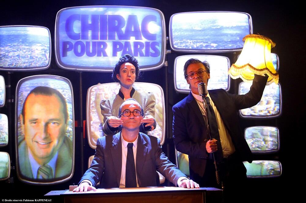 Trois comédiens font virevolter plus de 20 personnages : Dassault, Bernadette, Pasqua, Marie France Garaud, Pierre Juillet, Claude Chirac, Sarkozy et tout le gang de Jacques Chirac. Menteur comme personne et gargantuesque, c’est un personnage de théâtre. On va s’étonner et rire parce que c’est du théâtre et que le burlesque n’enlève rien au tragique.