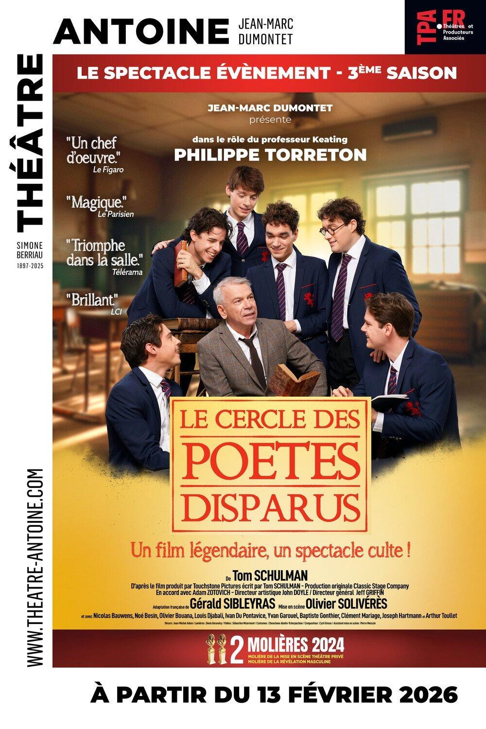 Reprise auThéâtre Antoine à Paris, découvrez l'adaptation du film culte Le Cercle des Poètes Disparus, de Peter Weir, par Gérald Sibleyras (co-auteur, entre autres, de Berlin Berlin au Théâtre Fontaine). Sur les planches, Philippe Torreton tient le célèbre rôle du Professeur Keating (joué par Robin Williams en 1989).Côté mise en scène, on retrouve le talentueux Olivier Solivérès (Les Aventures de Pinocchio, ADOS, Space Wars...)