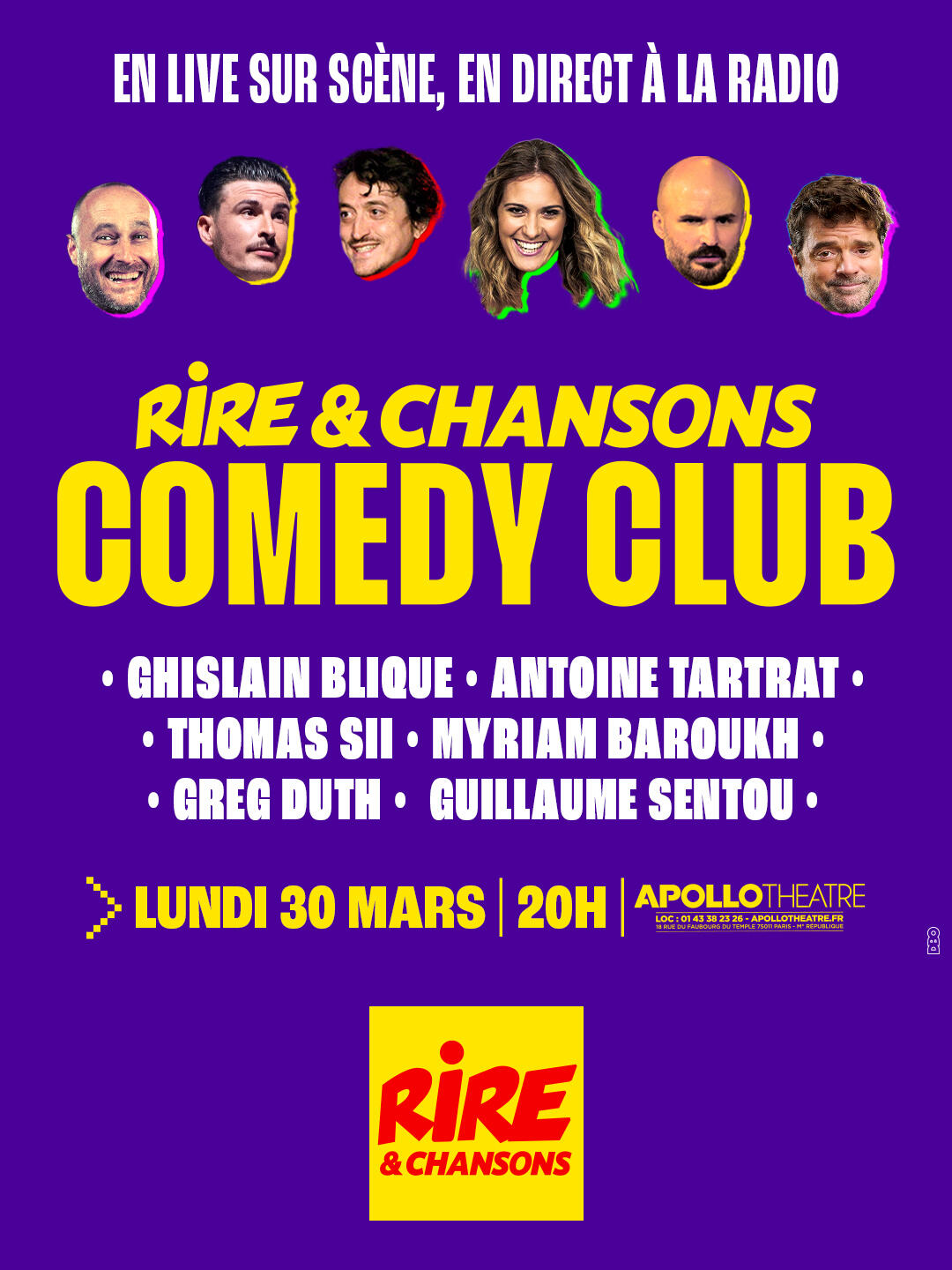RIRE ET CHANSONS COMEDY CLUB : une fois par mois,venez découvrir sur la scène de l'Apollo Théâtre les nouveaux talents du Rire sélectionnés par Rire et Chansons.