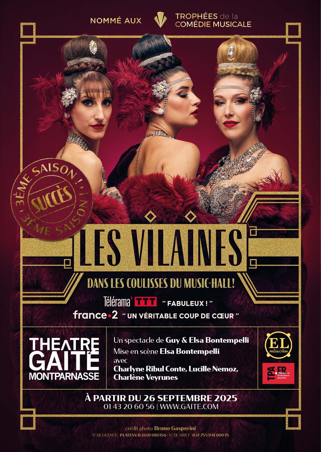Si tout le monde connait de loin le monde voluptueux des cabarets mythiques parisiens, vous ne pourrez jamais soupçonner ce qui s'y passe dans les coulisses. Le trio des Vilaines vous conduit avec humour, poésie et une pointe de féminisme dans cet univers chatoyant. Les textes d'Elsa et Guy Bontempelli sont remarquables d'efficacité servis par trois comédiennes-chanteuses attachantes et pleines de talent. Le faste des costumes et la beauté des interprètes ne gâchent rien à l'affaire.