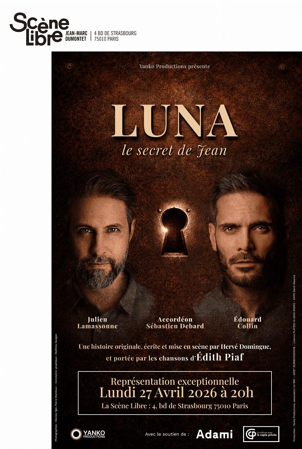 Une complicité se construit. Dans l’ombre, leurs silences changent de nature. Porté par les chansons d’Édith Piaf, un accordéon et deux voix masculines, LUNA, le secret de Jean traverse l’Histoire par l’intime et transforme les silences en musique.