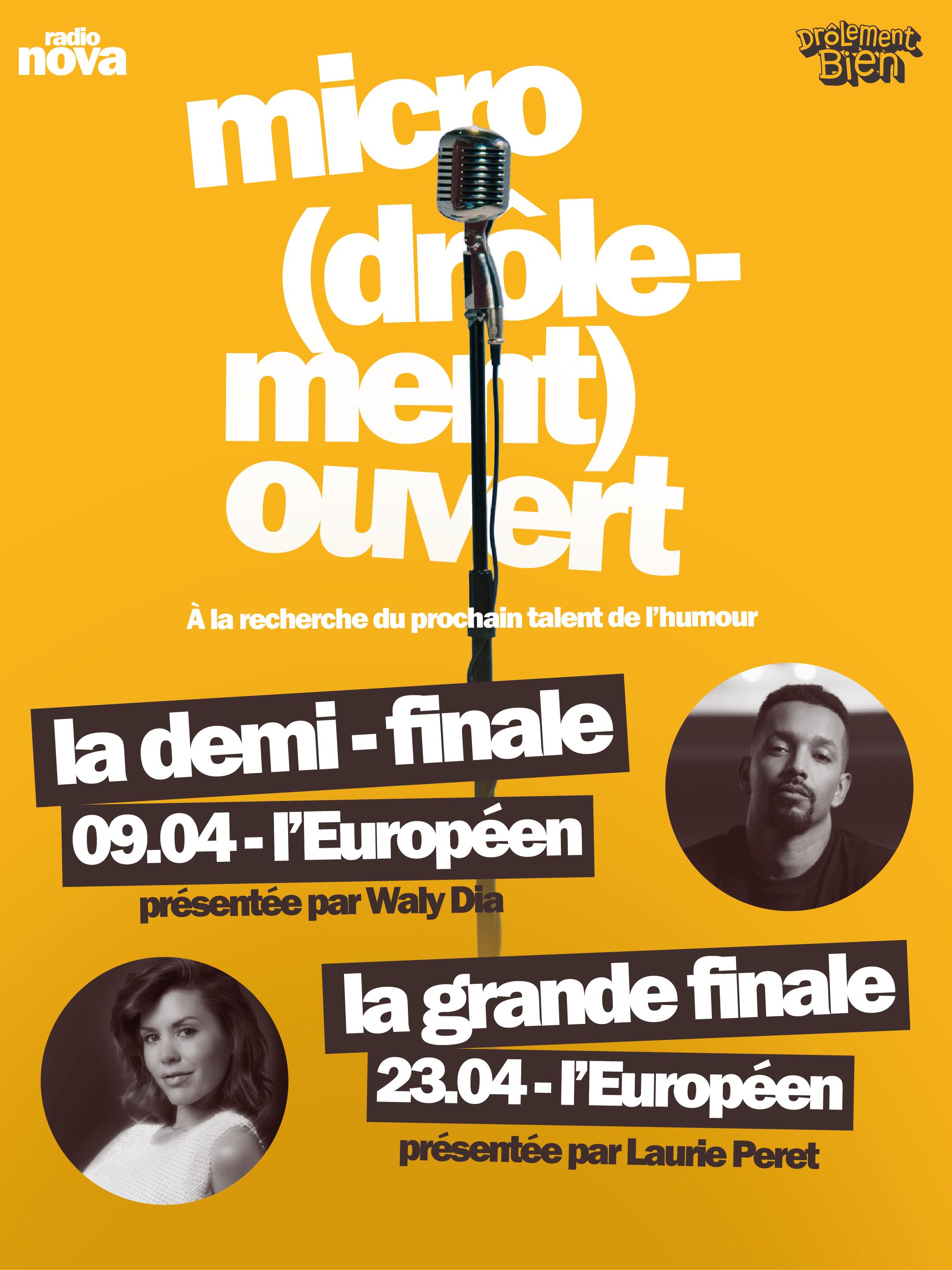 C'est l'heure de vérité du tremplin Micro (drôlement) ouvert. Après une demi-finale électrique, les finalistes se retrouvent sur la scène mythique de L'Européen pour l'ultime bras de fer humoristique. L'enjeu est de taille : le ou la gagnante ne repartira pas seulement avec les applaudissements du public, mais avec son propre micro sur Radio Nova ! Orchestrée par l'incontournable Laurie Peret, cette soirée promet d'être un condensé d'audace, de punchlines et d'émotions. Qui deviendra le nouveau visage (et la nouvelle voix) de l'humour francophone ? Soyez là pour vivre ce couronnement en direct.