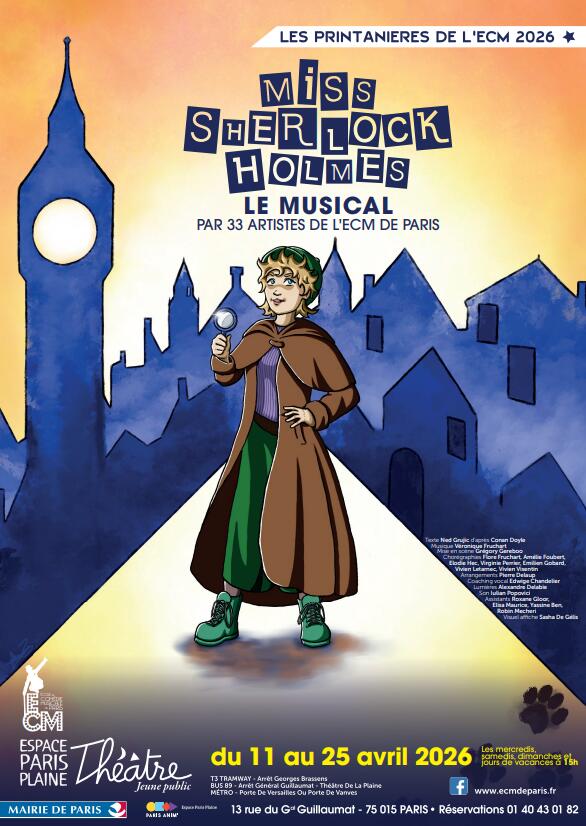 Miss Sherlock Holmes, spectacle musical interprété par les 34 élèves de l’École de Comédie Musicale de Paris, est au programme de l’Espace Paris Plaine (Paris 15ᵉ) du 11 au 25 avril 2026 pour une enquête scénique inspirée du Chien des Baskerville.