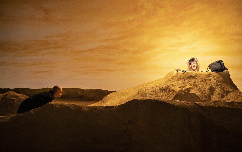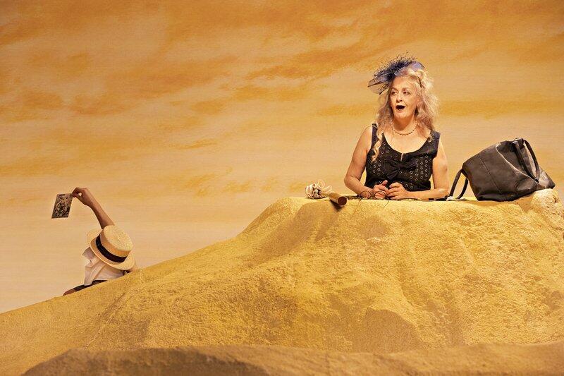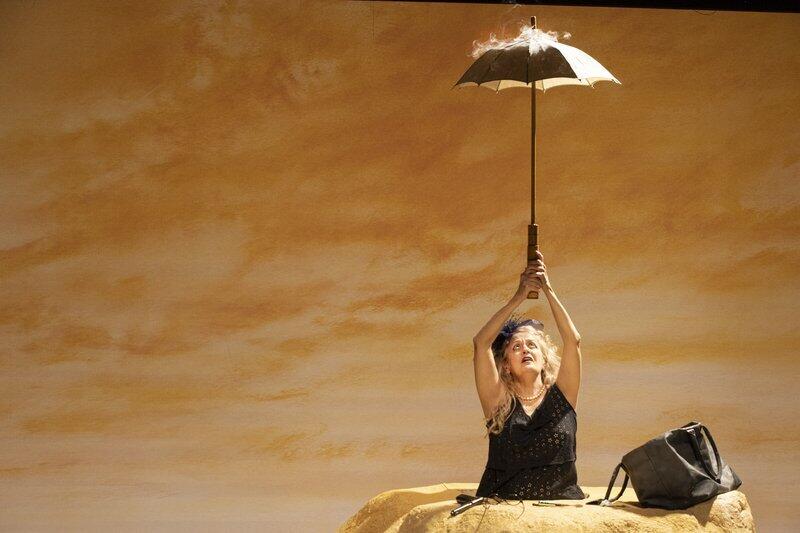 Winnie parle, s’accroche, s’enfonce. Enterrée jusqu’à la taille, puis jusqu’au cou, elle déroule inlassablement le fil de ses souvenirs, ses rituels, ses illusions de bonheur. Face à elle, Willie, mutique, presque absent.