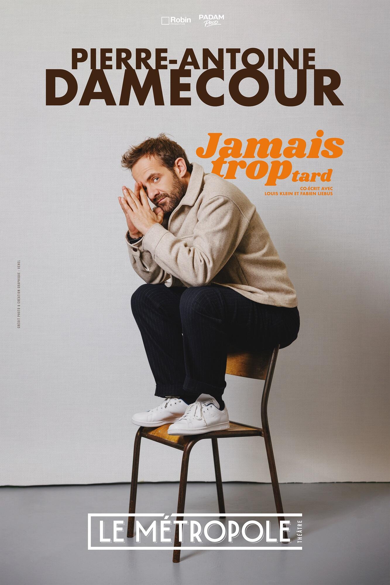 Retrouvez Pierre-Antoine Damecour dans Jamais trop tard, un one-man show d’humour joué du 11 mars au 24 juin 2026 au Théâtre Le Métropole, au cœur du 2ᵉ arrondissement de Paris, où l’humoriste dévoile avec sincérité et autodérision son premier seul-en-scène.
