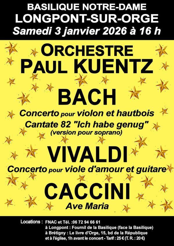 Pour ce concert de fin d'année, l'orchestre PAUL KUENTZ vous propose un programme exceptionnel, qui commencera par le concerto pour violon et hautbois de Jean-Sébastien Bach. La sublime soprano Kristina Vahrenkamp interprétera la cantate 82 dans sa version pour soprano et flûte. En deuxième partie, on entendra une oeuvre d'Antonio Vivaldi rarement donnée, le double concerto dans lequel la viole d'amour dialogue avec la guitare. Kristina Vahrenkamp clôturera le concert avec cet émouvant Ave Maria de Caccini.