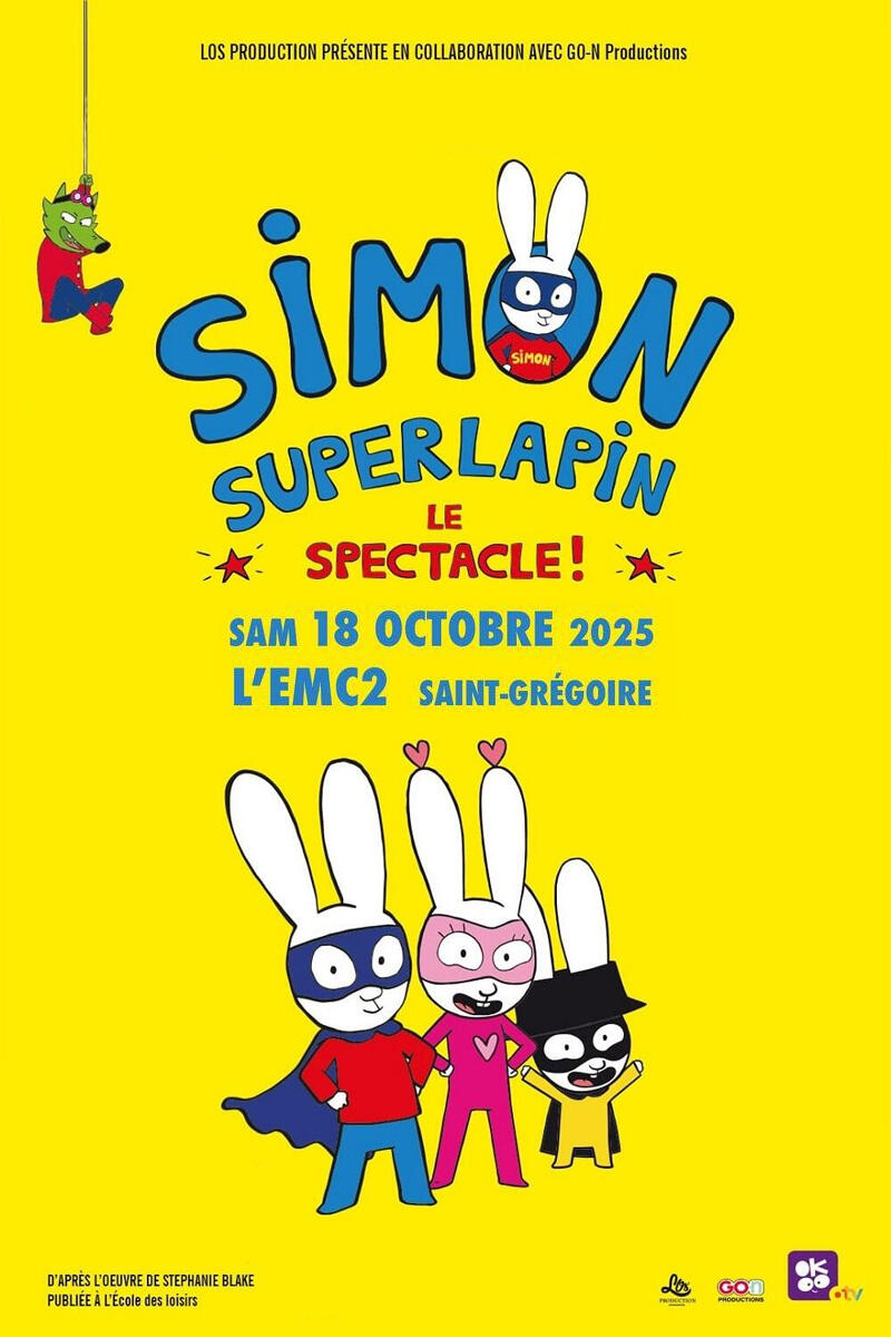 À l'occasion de sa tournée, Simon Superlapin - Le spectacle fait escale en Bretagne, à Saint-Grégoire, tout proche de Rennes pour une représentation unique le 18 octobre 2025. Retrouvez ce show familial exceptionnel sur la scène de l'EMC2 !