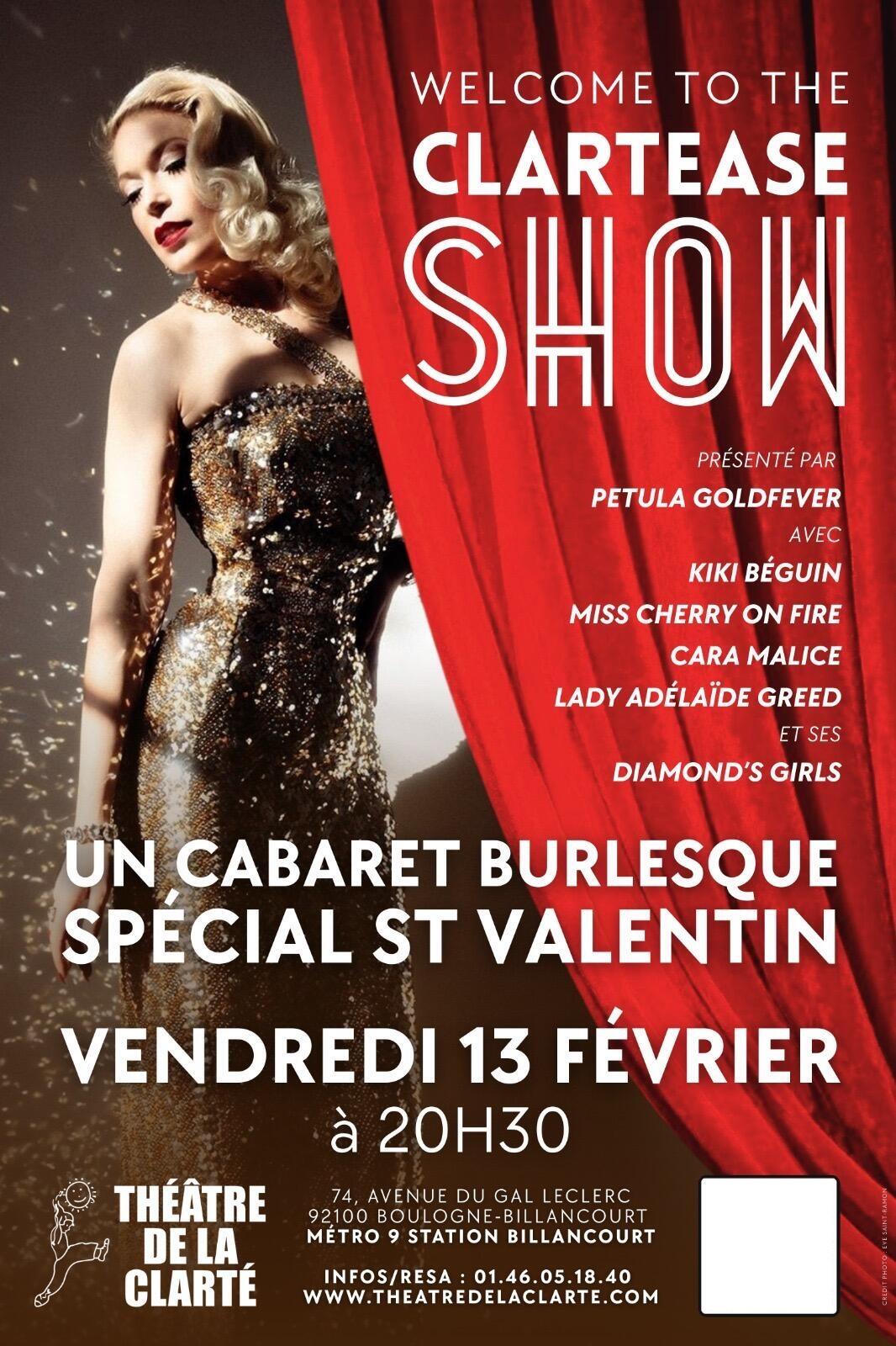 Des plumes, des paillettes, du chant, de l’humour... le Théâtre de la Clarté vous propose un cabaret burlesque spécial Saint Valentin pour célébrer l'amour, ou pour aider à tourner la page avec glamour !Au programme des numéros pour parler couple, célibat, passions et déceptions, imaginés par des artistes audacieuses et malicieuses.La soirée est orchestrée par Petula Goldfever, figure de l'effeuillage burlesque qui a même été Césarisée (mais pas encore pour le cinéma), et vous pourrez applaudir :