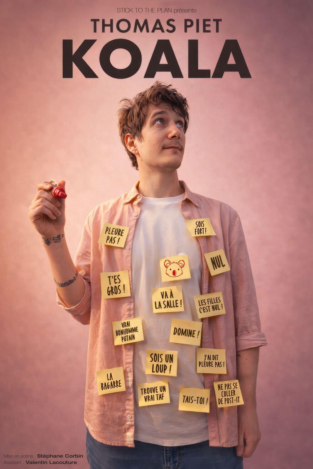Koala est un seul-en-scène drôle, musical et intime où Thomas démonte tout ce qu'on a mis dans sa tête pour faire de lui un "vrai bonhomme putain !" De la naissance à l'âge adulte, il démonte avec humour les injonctions à la virilité : taire ses émotions, haïr son corps, performer le sexe et se taire. Entre satire féroce et moments bouleversants, Koala parle de masculinité, de consentement, de vulnérabilité et de réconciliation avec soi.