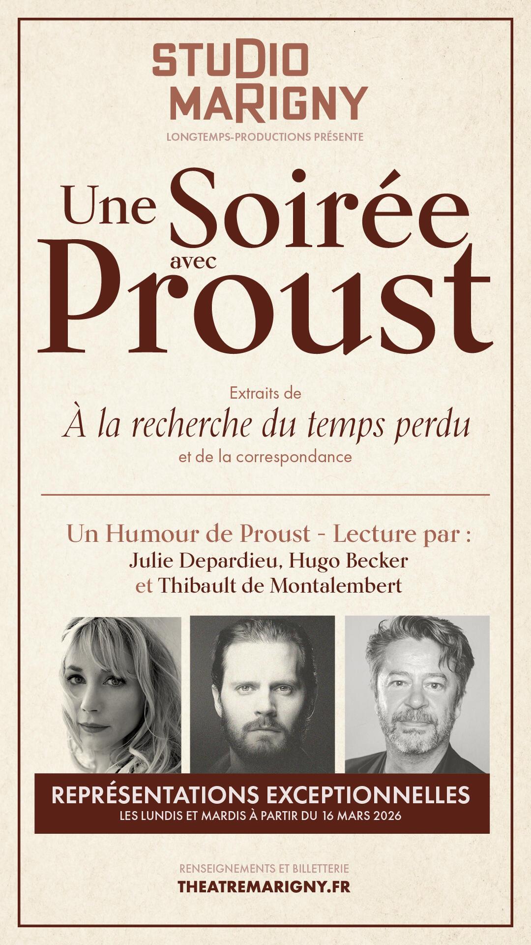 Soirée exceptionnelle au Théâtre Marigny, pour une lecture de la correspondance et des passages les plus emblématiques du chef d'oeuvre de Marcel Proust « A la recherche du temps perdu »