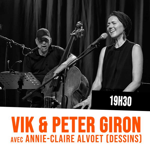 Le duo hors pair de la chanteuse Vik (lauréate du prestigieux concours Sarah Vaughan 2019) et du contrebassiste Peter Giron (Rick Margitza, Kurt Elling, Luther Allison) sera illustré en live, avec projection sur scène, par la dessinatrice de jazz par excellence Annie-Claire Alvoët (Jazz Magazine, en exposition sur les murs de Sunside).
