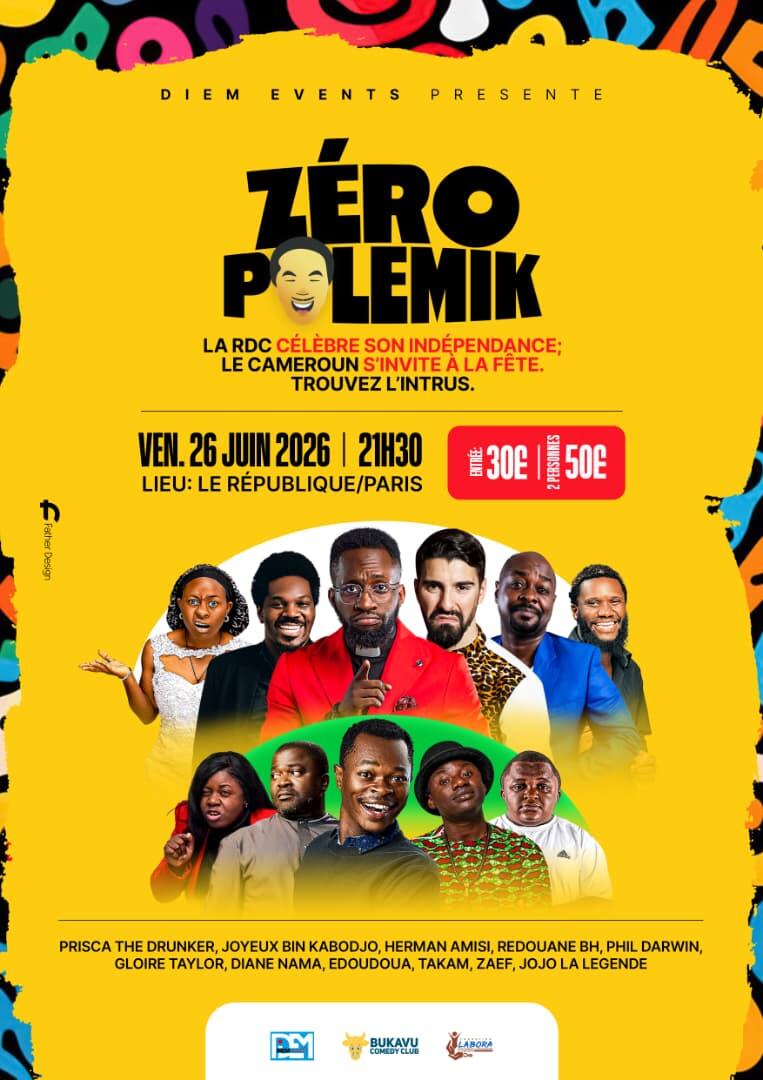 À l’occasion de la fête de l’indépendance de la RDC, Zéro Polémique réunit le meilleur de l’humour congolais pour une soirée exceptionnelle dédiée à la diaspora africaine. Entre punchlines, autodérision et ambiance 100% festive, les artistes venus tout droit de Congo partagent la scène avec des humoristes invités du Cameroun pour un mélange explosif de cultures et de rires. Un seul mot d’ordre : rire ensemble, sans prise de tête… zéro polémique, 100% bonnes vibes !