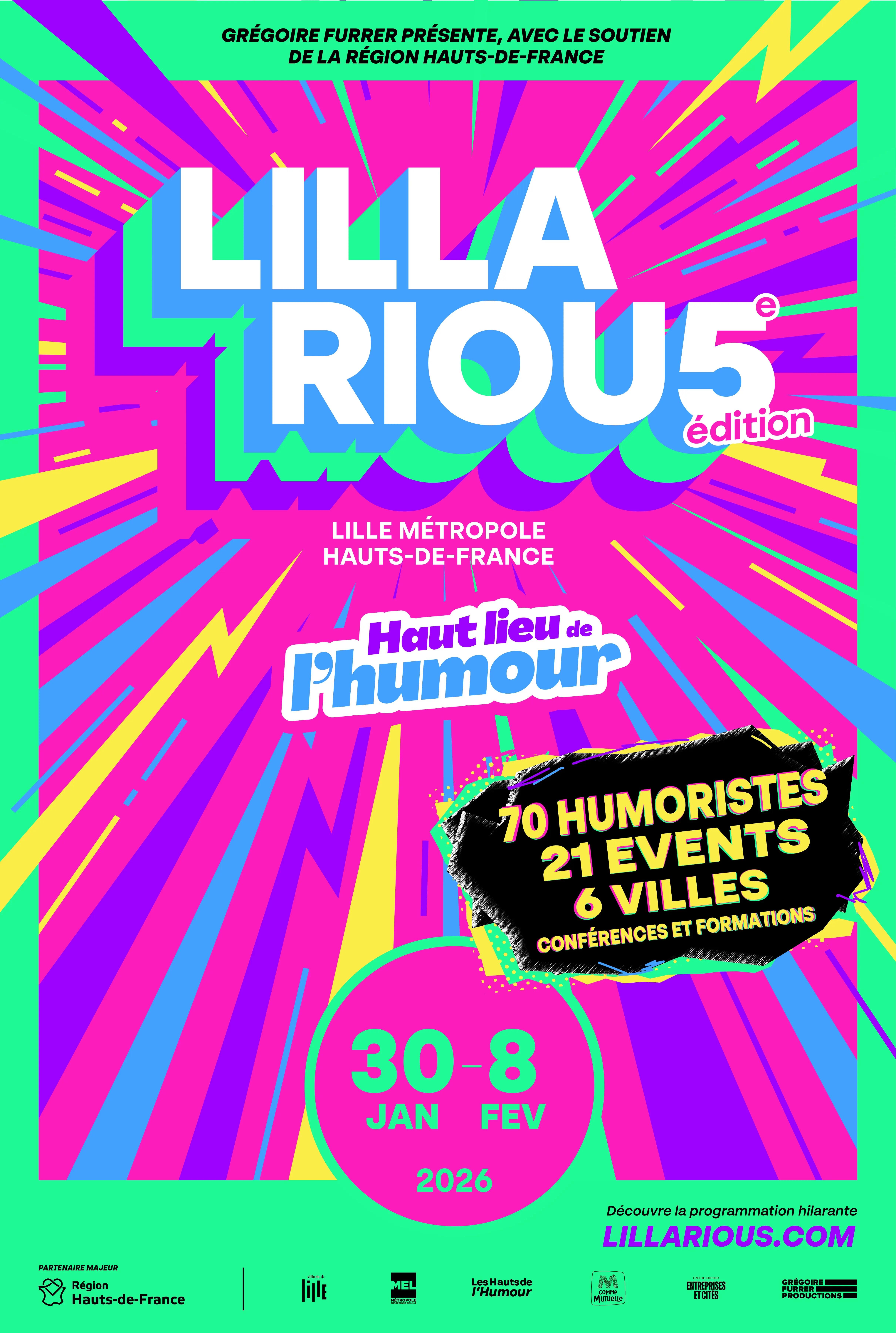 C’est vraiment dans le Nord qu’on rit le plus fort ! Grégoire Furrer Productions est fier de présenter la 5e édition du Festival Lillarious à Lille. Conçu sur mesure pour la région Hauts-de-France à l’initiative de ce beau projet, Lillarious inspire et innove. Galas, débats, conférences et formations rythment ce festival qui réunit les publics et les organisations pour parler de l'Humour et rire ensemble.